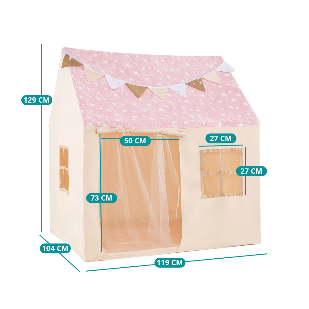 Le stelle sul tetto rosa brillano delicatamente al buio, creando un’atmosfera speciale per il gioco. Le luci bianche calde e le piccole bandierine rendono la casetta accogliente, ideale per la storia della buonanotte o per momenti di tranquillità.