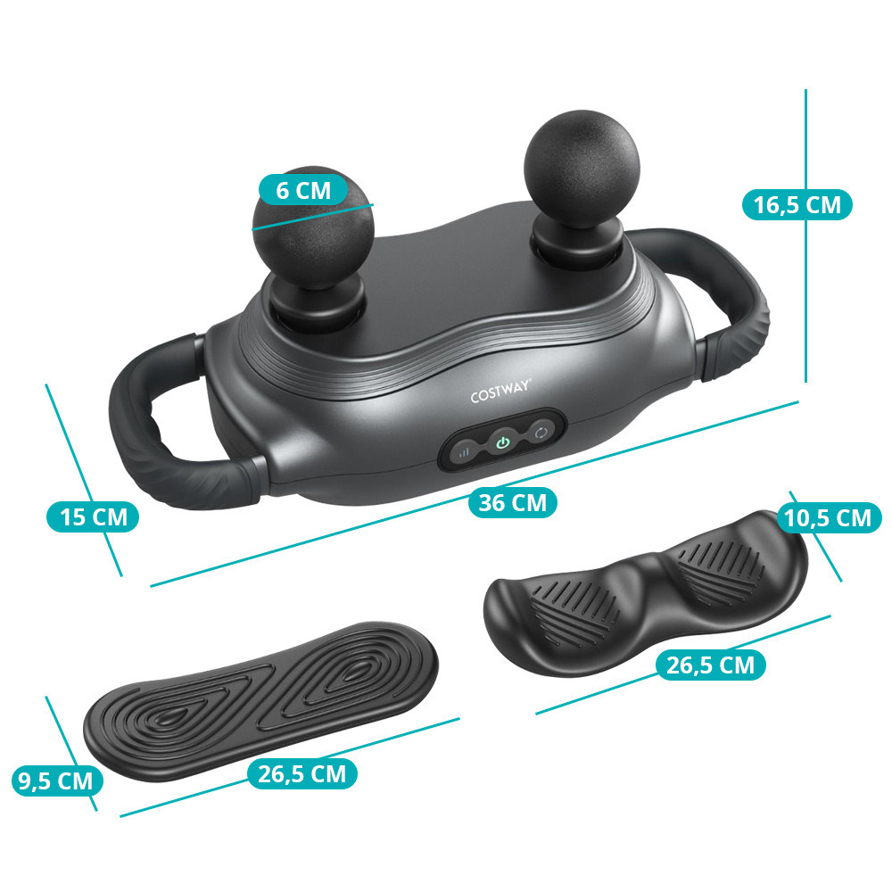 Il dispositivo è dotato di tre diverse teste di massaggio progettate per vari gruppi muscolari. La testa a doppia sfera offre un massaggio profondo, la testa a forma di W è ideale per cosce, polpacci e braccia, mentre la testa piatta è adatta per aree muscolari più grandi. Il massaggiatore offre tre modalità di massaggio selezionabili: vibrazione continua, massaggio pulsante e modalità rilassante. Questo consente una facile personalizzazione in base alle esigenze specifiche dell'area del corpo.