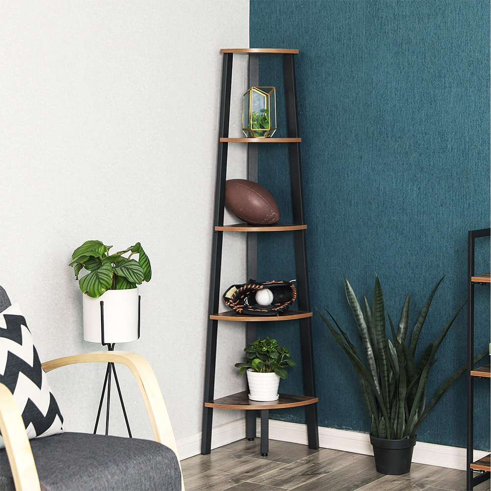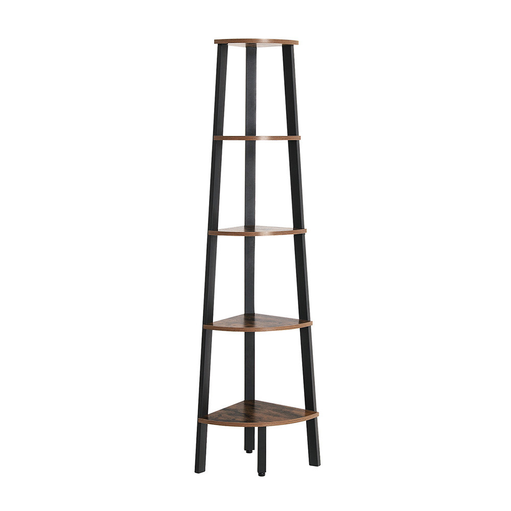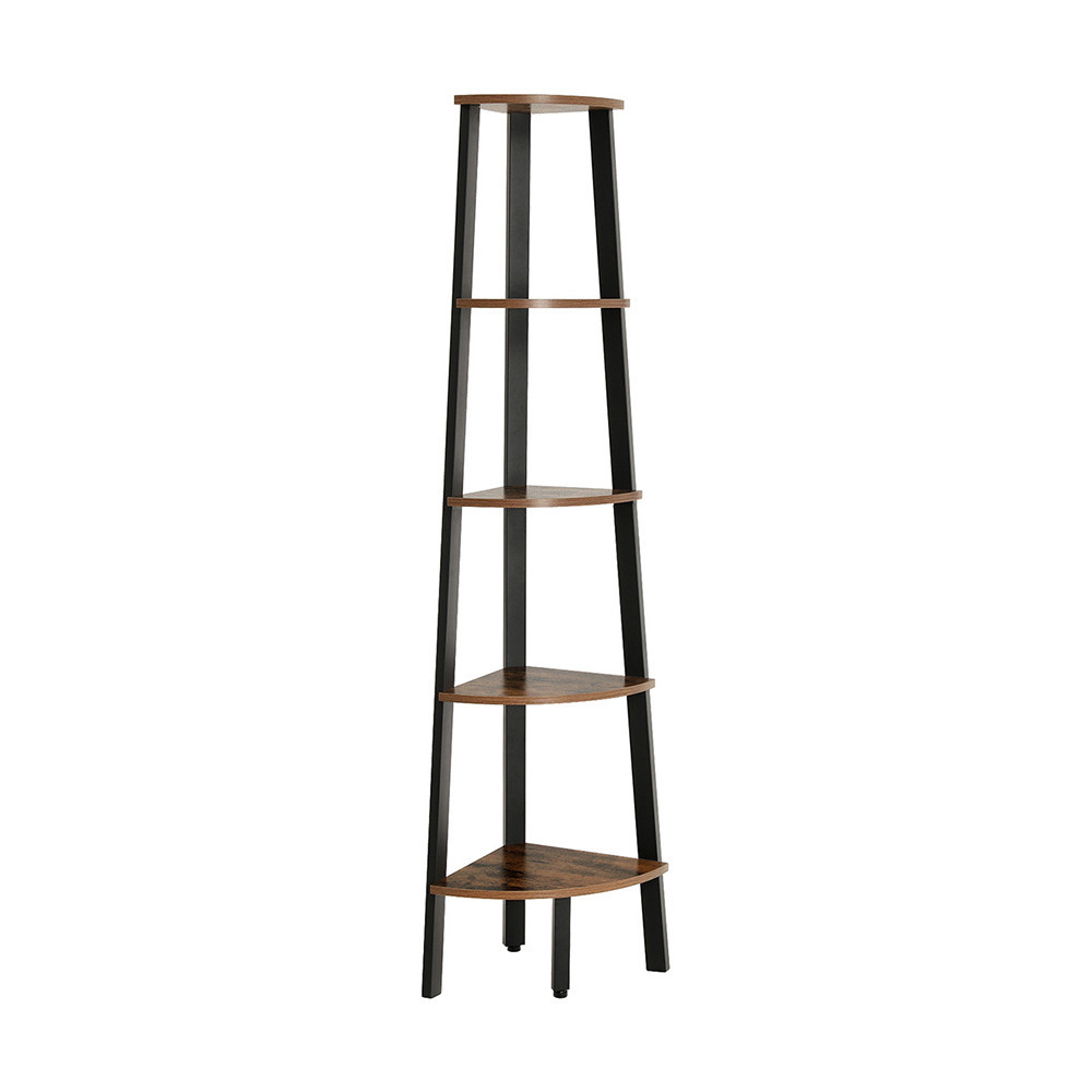 La mensola angolare presenta ripiani marroni rustici e una struttura in acciaio nero che evocano sia il fascino vintage che l'eleganza industriale. È la scelta perfetta se desideri un pezzo di arredamento distintivo ma minimalista per l'angolo del tuo soggiorno, studio o camera da letto.