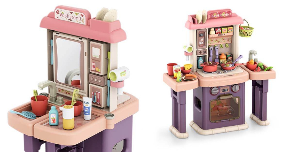 La cucina e il bagno da gioco combinano in modo unico le due attività di gioco di ruolo più popolari. Un lato funge da cucina dove i bambini possono "preparare" i loro pasti, mentre l'altro lato li introduce al mondo degli accessori da bagno. Questa combinazione consente lo sviluppo della creatività, delle abilità motorie fini e della conoscenza delle routine quotidiane tutto in una volta.