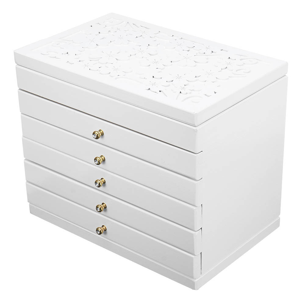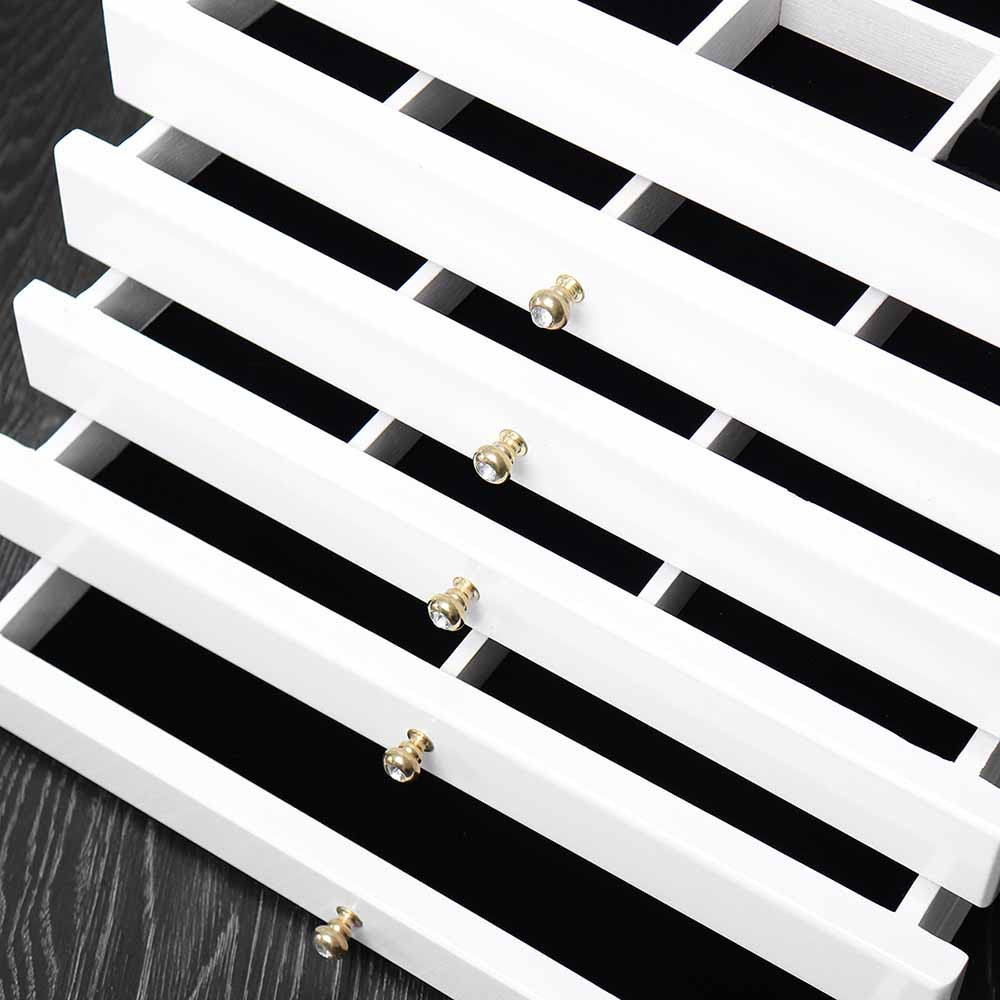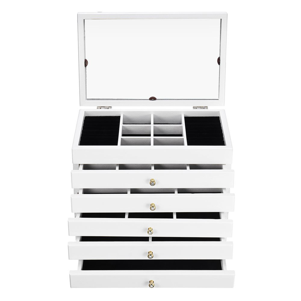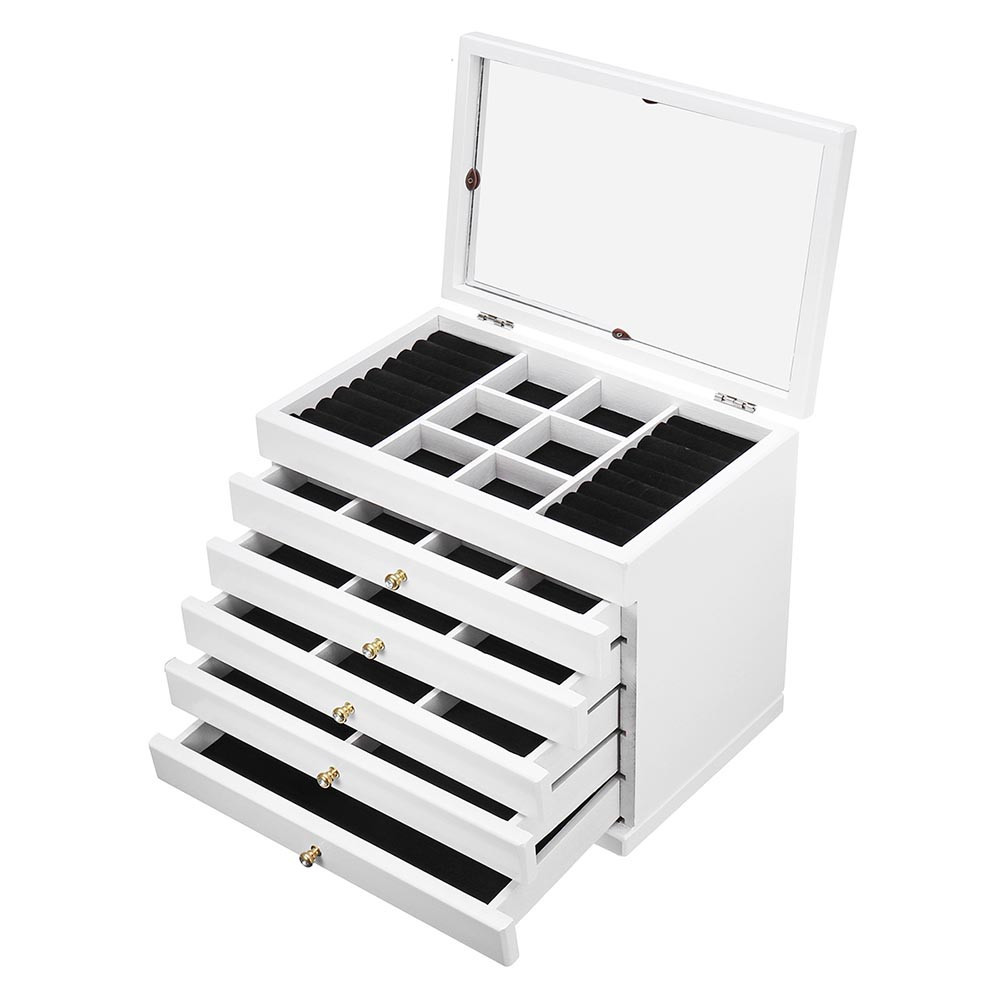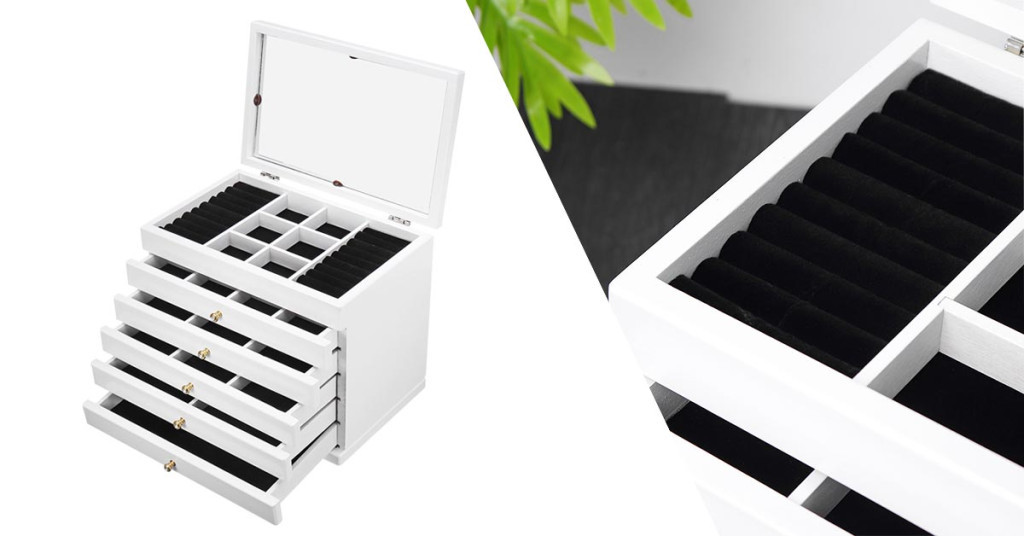 Questo organizzatore di gioielli a 6 scomparti è la scelta perfetta per chi cerca di riporre i propri gioielli preferiti in modo ordinato. I cinque cassetti estraibili e i compartimenti di stoccaggio separati garantiscono che ogni accessorio abbia il proprio posto. I rulli speciali progettati per gli anelli prevengono i graffi, mantenendo al sicuro anche i tuoi pezzi più costosi.