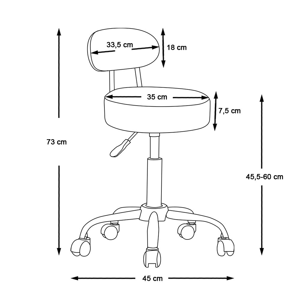 La sedia presenta un sedile con un diametro di 35 cm e uno spessore di 7,5 cm, offrendo comfort anche durante un uso prolungato. Lo schienale, che misura 33,5 cm di larghezza e 18 cm di altezza, offre un supporto adeguato, riducendo il mal di schiena. L'altezza del sedile regolabile (45,5–60 cm) consente di adattarla a qualsiasi ambiente di lavoro o altezza corporea, rendendola ancora più comoda da usare.