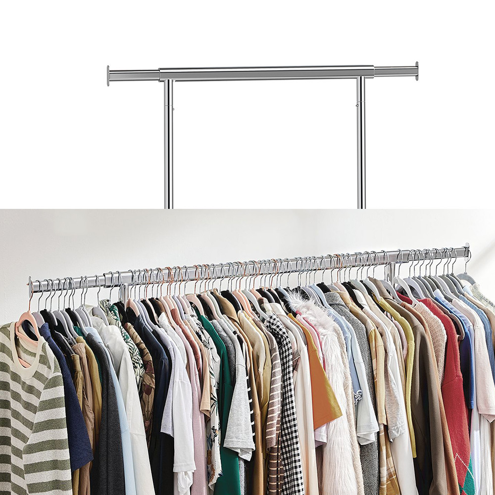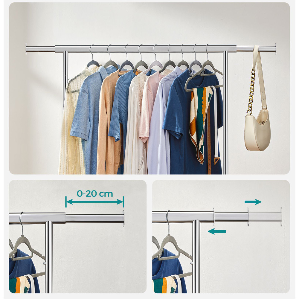 La barra superiore può essere estesa di 20 cm su ciascun lato, permettendo di farci stare più vestiti, e puoi comodamente posizionare borse o sciarpe agli estremi. Puoi anche riporre scatole sotto le barre inferiori.
