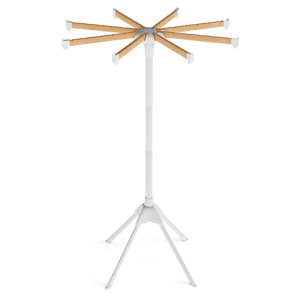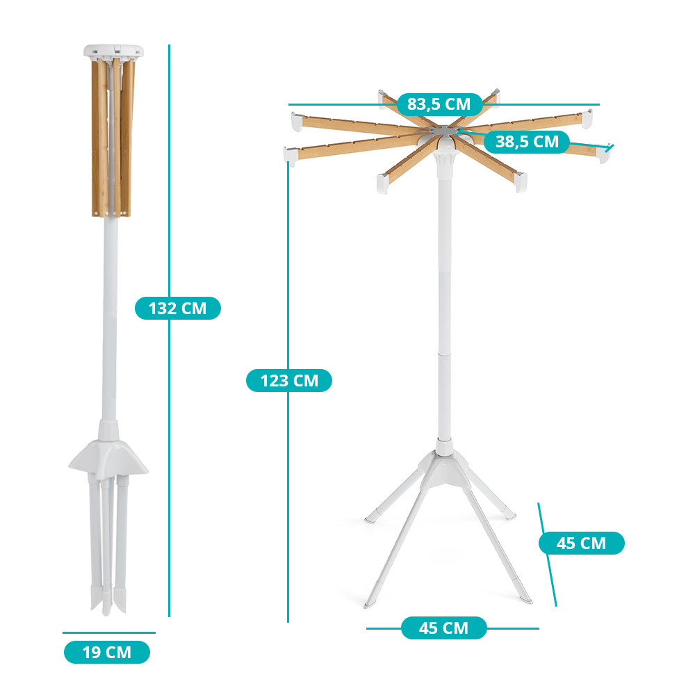 Le aste possono essere aperte e chiuse singolarmente, permettendo di utilizzare lo stendibiancheria in configurazioni di 90°, 180°, 270° o addirittura 360°. È adatto sia per asciugatura appesa che piatta.