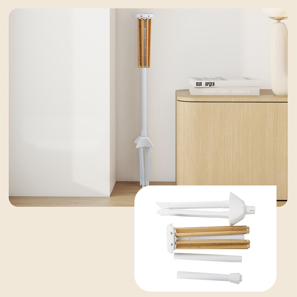 La combinazione di bambù e elementi bianchi crea un aspetto pulito e naturale che si adatta bene a un balcone, a un bagno o a una lavanderia.