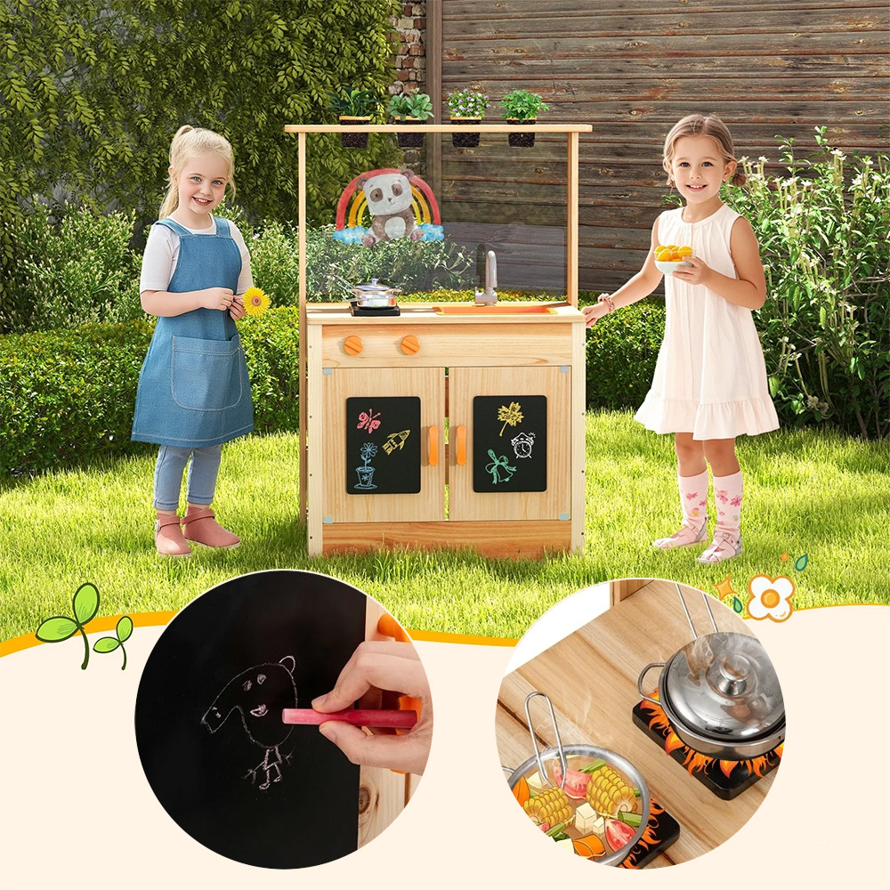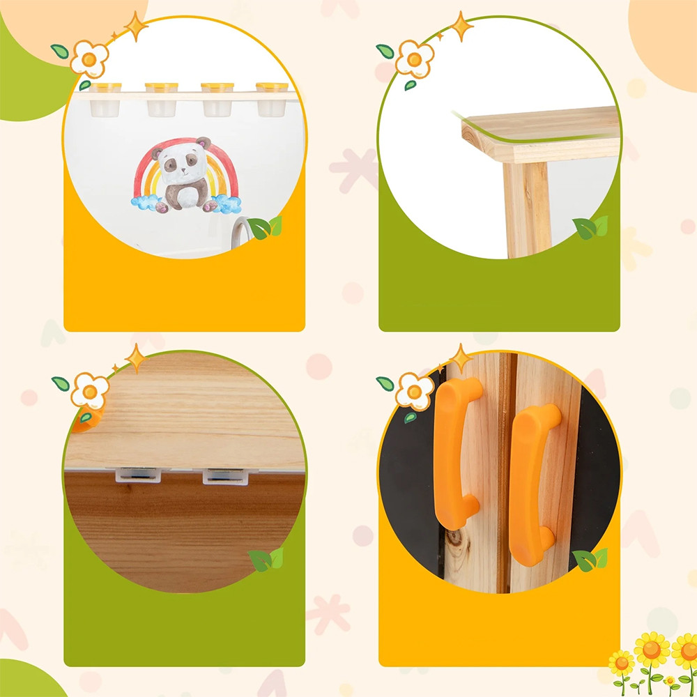 Le lavagne integrate con gessetti e una gomma offrono opportunità di espressione creativa: i bambini possono disegnare, scrivere ricette o persino tenere note sul giardino. L'ampio armadietto di stoccaggio aiuta a mantenere organizzati strumenti e accessori.