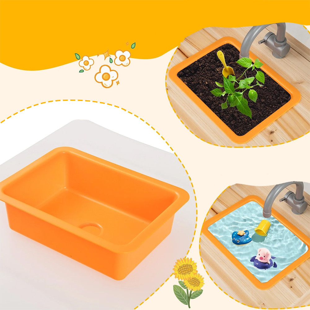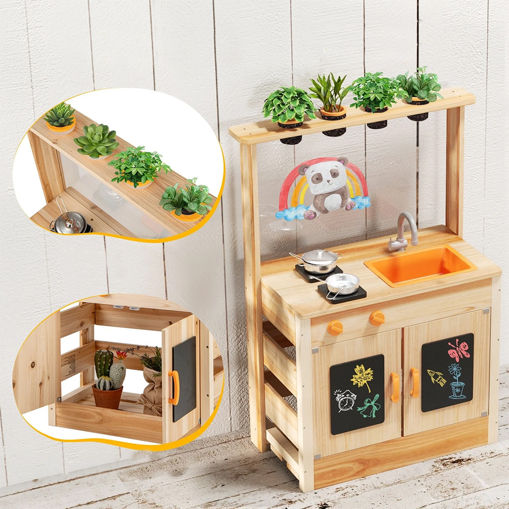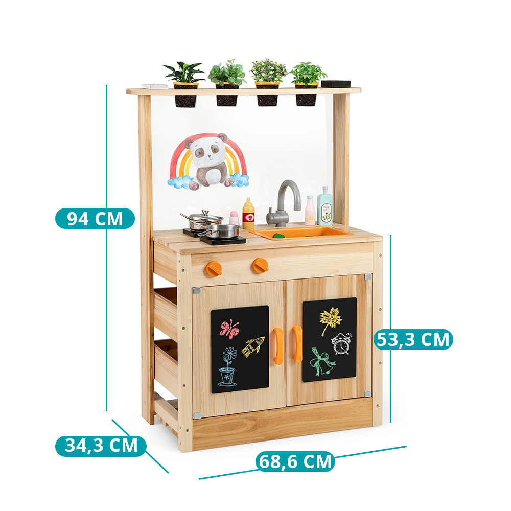 Questo tavolo da gioco in legno di pino offre un ambiente ideale per il gioco all'aperto. Le caratteristiche realistiche – come il piano cottura, le manopole rotanti, il lavandino e gli utensili da cucina – permettono ai bambini di immergersi nel gioco di ruolo mentre sviluppano le loro abilità motorie fini e la loro immaginazione.