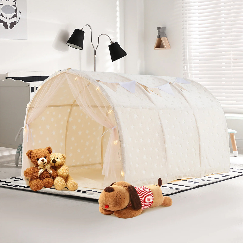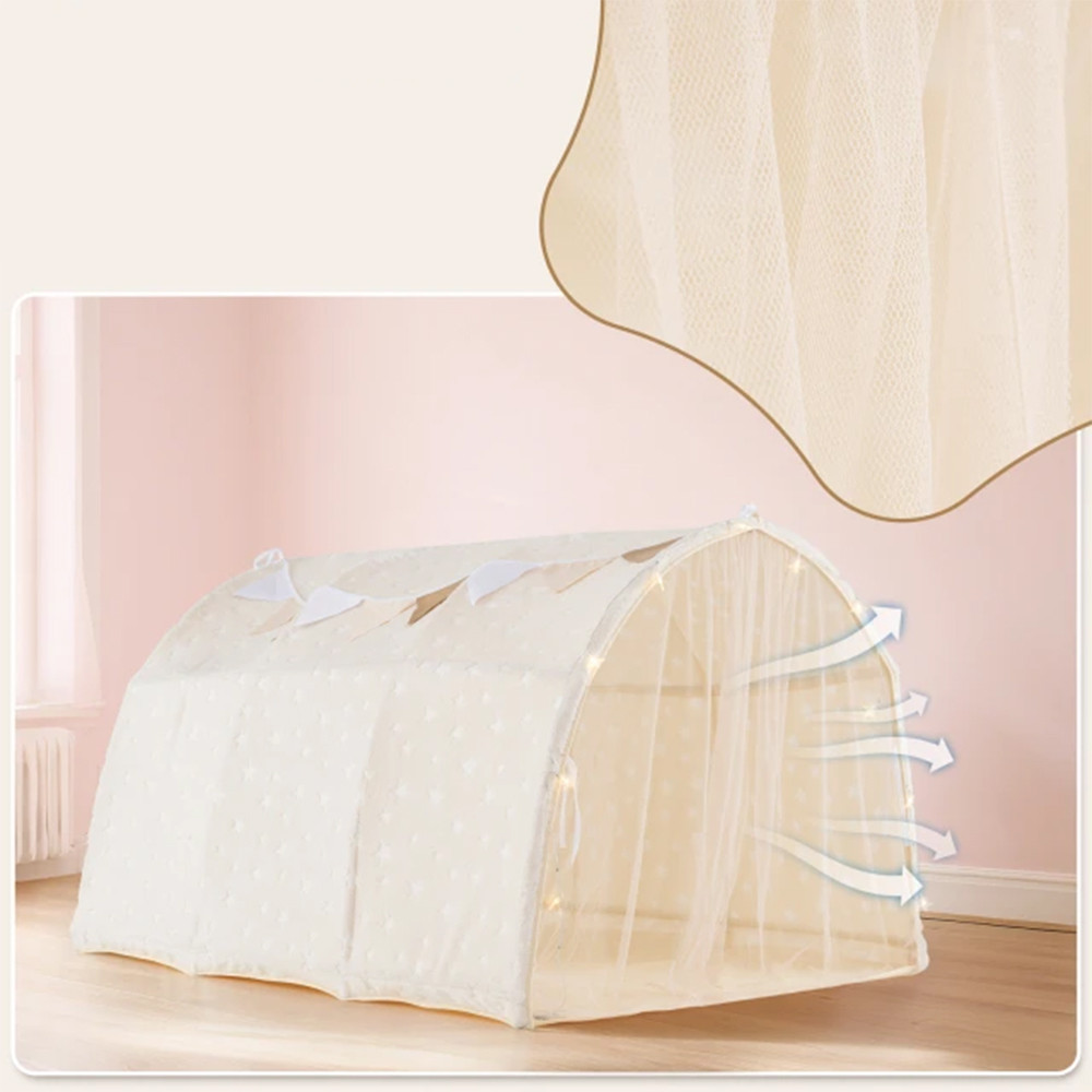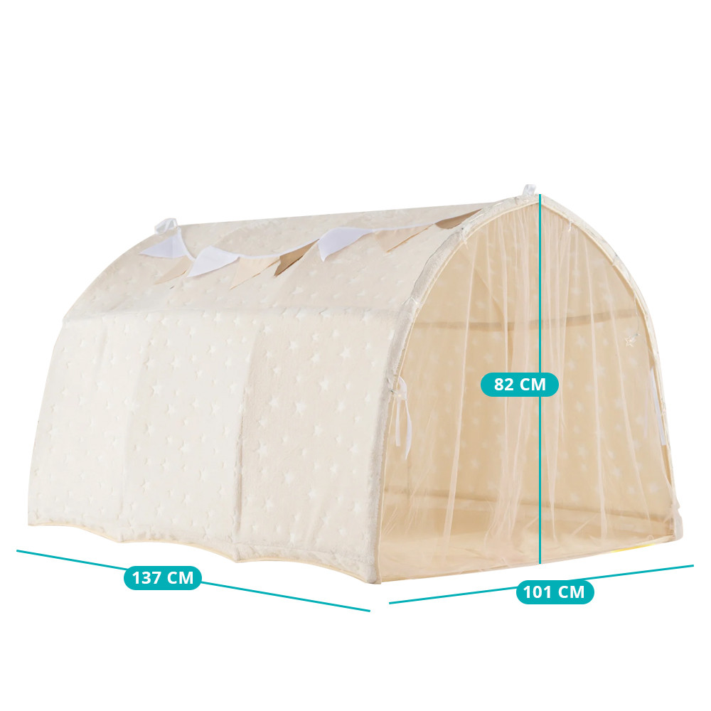 Le luci a stringa a forma di stella e la ghirlanda decorativa di bandierine conferiscono alla tenda un'atmosfera da favola. Il colore beige e le texture morbide si integrano armoniosamente nella maggior parte delle stanze dei bambini, catturando immediatamente l'attenzione.